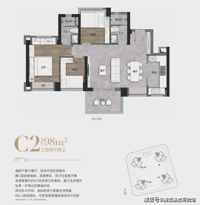 98平的3房2厅2卫户型,设计的横厅格局,南北通透,L型厨房,主卧双飘窗通透设计。