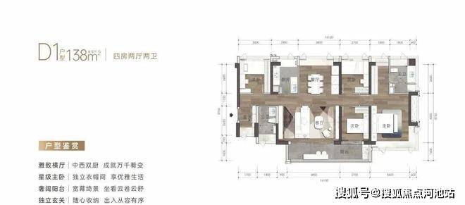臻悦府住宅户型方面,臻藏级南向湾海视野,LDKB人性化动线设计,格局方正、高实用率,打造独立玄关、双飘窗主卧、步入式衣帽间等个性化空间。