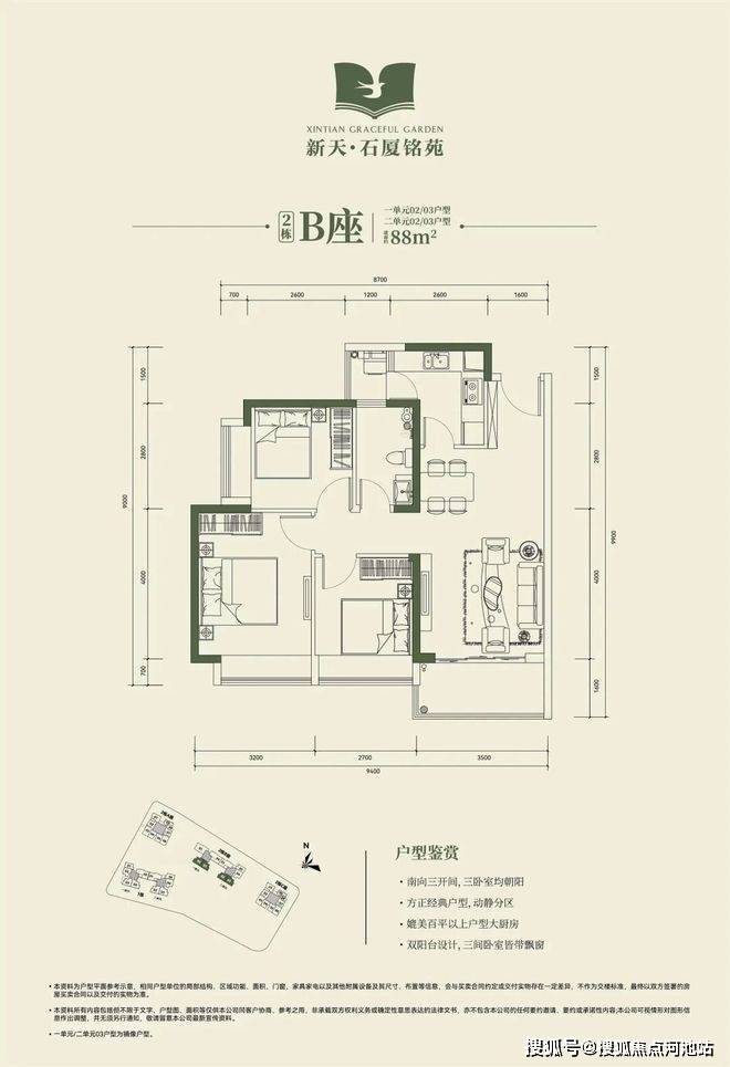 2栋B座一单元02、03户型、2栋B座二单元02、03户型:面积约为88㎡的3房2厅1卫;