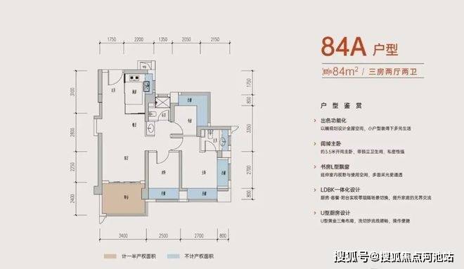 84㎡的3房2厅2卫,设计的是经典竖厅格局,进门入户玄关,客厅3.4米开间,LDKB一体化,S墙设计预留冰箱位,动静分区,分别做到了主卧13.5㎡/次卧8.75㎡/次卧8.6㎡(包含墙体飘窗),U型厨房,公卫三段式干湿分离,得房率约:77.2%(不含赠送),东北朝向。