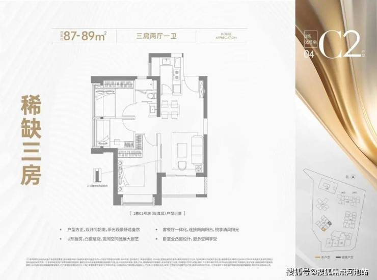 横厅南北通透格局,客餐厅6.6米开间,四开间朝南,主卧套房设计,6.6米超长观景阳台,得房率约72.45%(不含赠送),阳台主朝正南向。