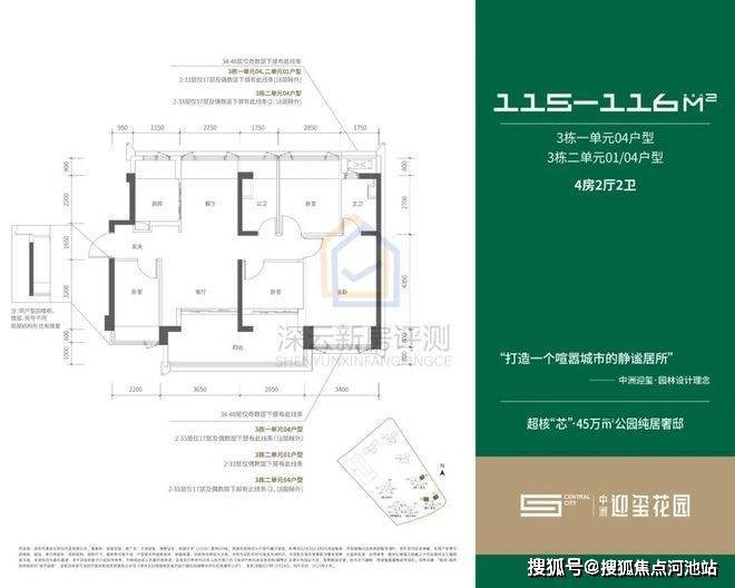 2单元:01、04户型115㎡;02、03户型96㎡;