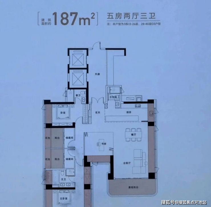 建面约187㎡五房两厅三卫,得房率约111%(包含赠送),西南朝向看海景景观。双套房设计。
