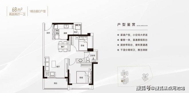 68㎡的2房2厅1卫,设计的是竖厅格局,客厅3.4米开间,LDKB一体化设计,动静分区,L型厨房带1个生活阳台,卫生间三段式干湿分离,得房率约79%(不含赠送),西南朝向。