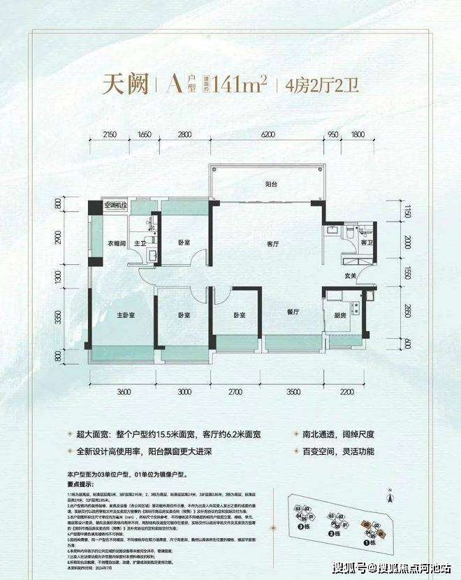 该户型南北通透,拥有约15.5m的超大面宽,五大空间朝南,南向采光面约15m,景观视野极佳,可谓豪门进阶大户!