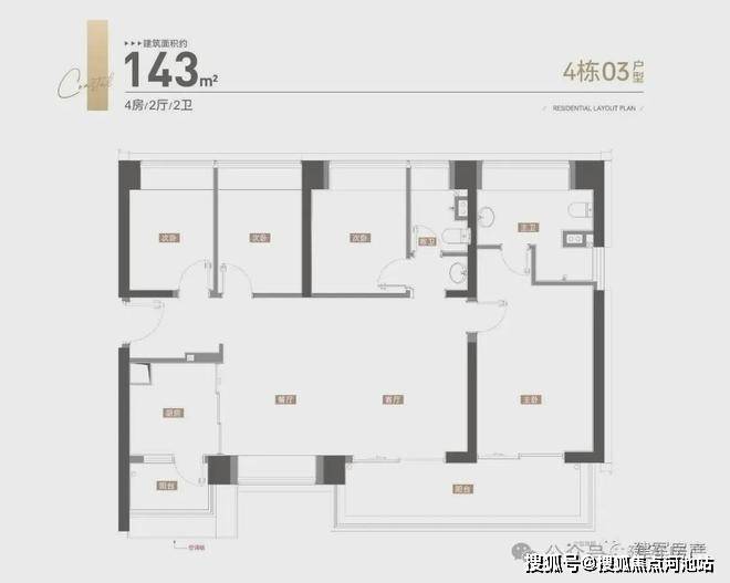 01户型142平4房2卫,02-03户型188平4房3卫,为楼王单位,层高3.15米,3梯3户。