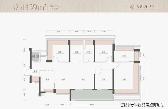 139㎡的5房2厅2卫,设计的是横厅南北通透格局,进门可做800库玄关还带1个设备平台,客餐厅6.5米开间,LDKB一体化,六开间朝南,分别做到了主卧21.63㎡/次卧13.13㎡/次卧10.65㎡/次卧9.45㎡/次卧7.81㎡(包含墙体飘窗),U型厨房,卫生间干湿分离,得房率约81%(不含赠送),客厅连接次卧出6.8米长的观景大阳台约12.24㎡,西南朝向。套内面积112.59㎡+飘窗23.69㎡+阳台5.67㎡+设备平台2.81㎡=实得面积144.76㎡,加上赠送后得房率约104.14%。