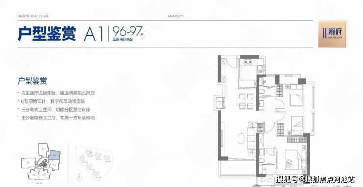 96-97㎡的3房2厅2卫,A1户型/2栋2单元02,设计的是竖厅格局,客厅3.5米开间,LDKB一体化,S墙设计预留冰箱卡槽位,动静分区,三开间朝南,双次卧东北向,得房率约78%(不含赠送),U型厨房,公卫三段式分离,东南朝向。