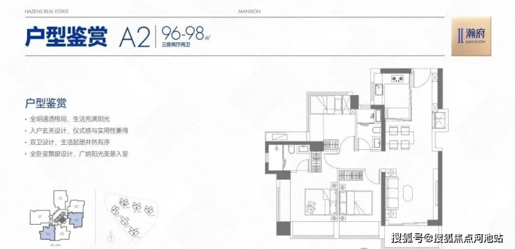 97-98㎡的3房2厅2卫,A3户型/2栋2单元05,设计的是经典竖厅格局,客厅3.5米开间,LDKB一体化,S墙设计预留冰箱卡槽位,动静分区,三开间朝南,主卧+1个次卧双飘窗,得房率约78%(不含赠送),U型厨房,卫生间干湿分离,西南朝向。