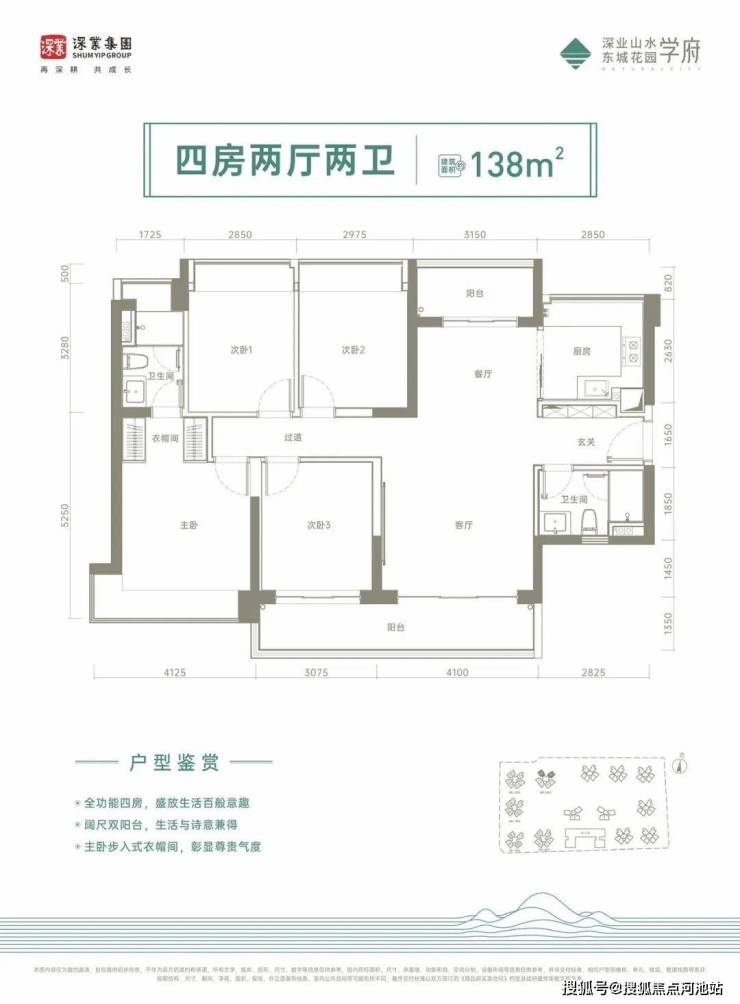 138㎡的4房2厅2卫,设计的是竖厅南北通透格局,进门入户玄关,客厅4.1米开间,南北通透双阳台,4个卧室分别做到了4.125米/3.07米/2.97米/2.85米的宽度,主卧大套间设计,客厅连接次卧出7.17米长的大阳台,U型厨房,卫生间干湿分离,得房率:75%(不含赠送),阳台主朝西南或东南向。