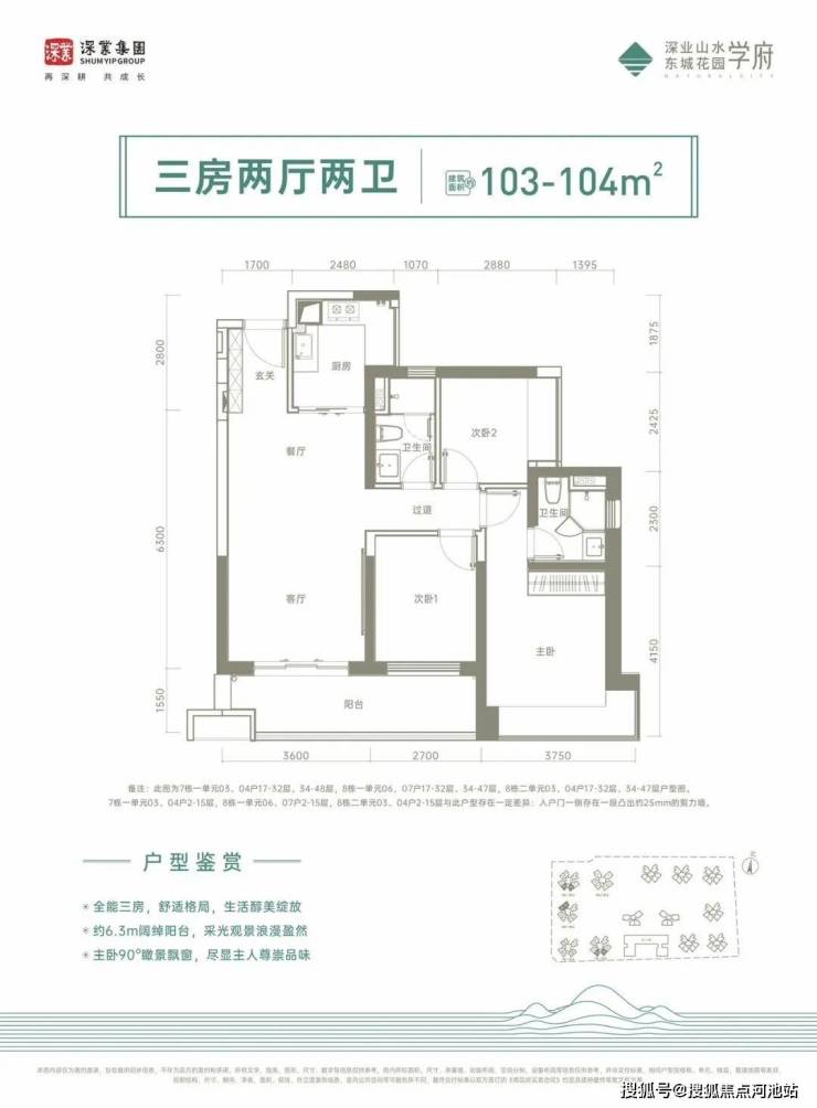 103-104㎡的3房2厅2卫,设计的是经典竖厅格局,进门入户玄关,客厅3.6米开间,LDKB一体化设计,3个卧室分别做到了3.75米/2.7米/2.42米的宽度,客厅连接次卧出6.3米的大阳台,U型厨房,卫生间干湿分离,得房率:75%(不含赠送),西南、东南或西北朝向。
