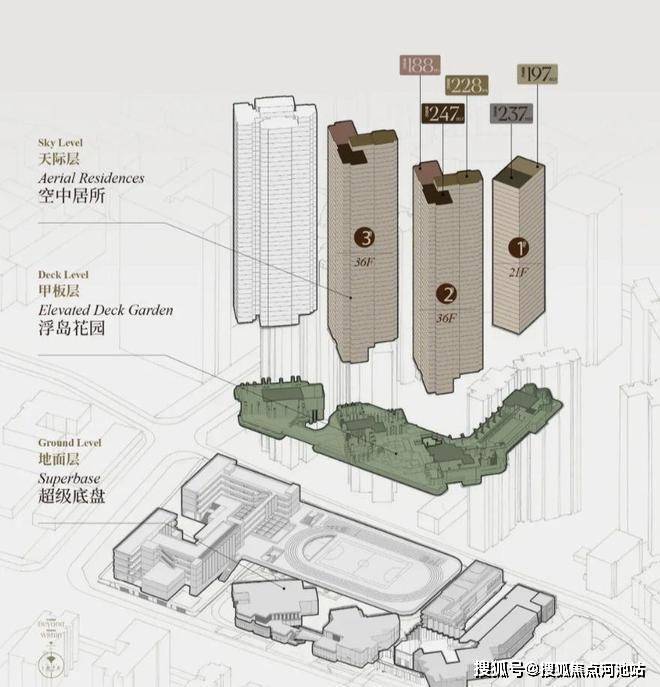 项目利用裙房屋顶打造拥有“仪式水轴“艺术庭院”“空中浮岛森林”三级景观设计的空中庭院,四栋住宅均漂浮于甲板之上,独享甲板庭院花园,以“海风吹拂下的豪宅底盘”托举城市上空的豪宅群落,形成立体景观系统。