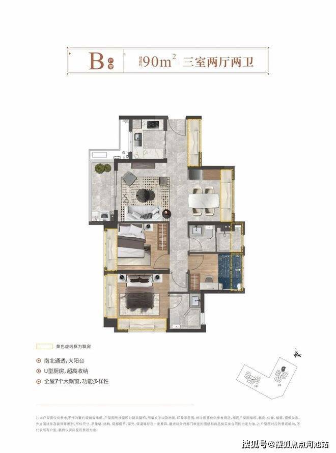 90㎡的3房2厅2卫,设计的是竖厅南北通透格局,仅2栋05户型有,客厅3.6米开间,四开间朝南,全屋飘窗设计,客餐厅错开布局,主卧双飘窗,U型厨房,得房率:76.35%(不含赠送),阳台主朝东南向。