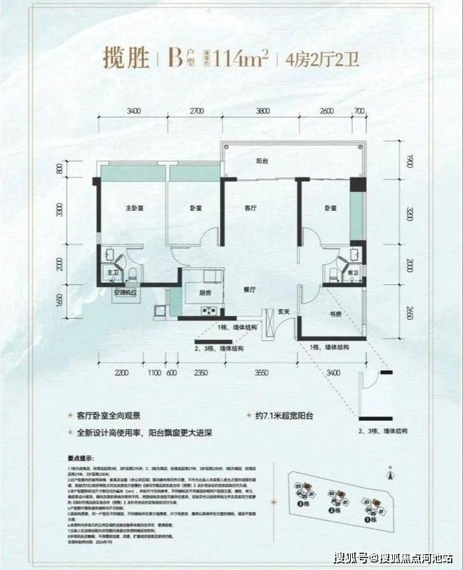 1栋38层(商品住宅),2栋33层(商品住宅+租赁),3栋32层(商品住宅),都是2T5户;总户数是480户,其中,商品住宅375户,自持租赁34户,保障租赁71户;