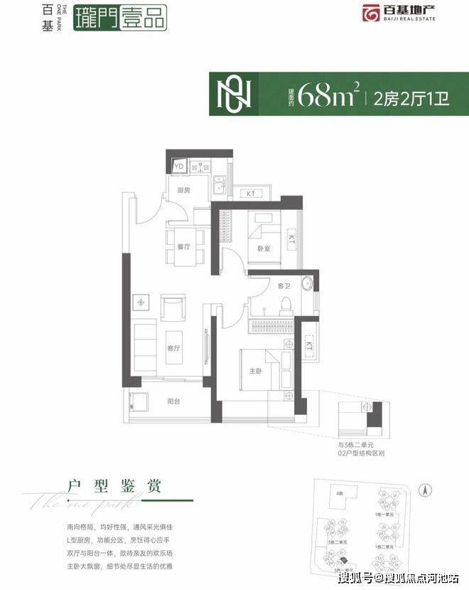 仅3栋1单元02户型,设计的是竖厅格局,客厅3.4米开间,LDKB一体化设计,L型厨房,卫生间干湿分离,东南朝向。