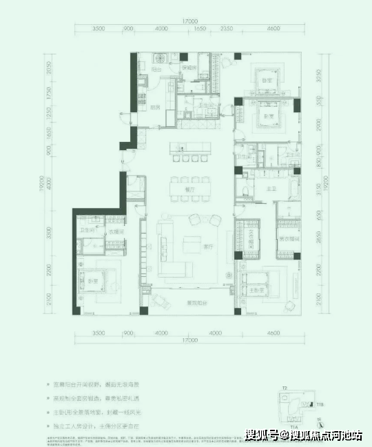 户型四套间设计,配备工人房,主佣分区,竖厅布局,约12m双厅进深,空间利用率很高。东端头位置,所有卧室都有开阔的景观,270°景观完全无遮挡。只存在T1B栋33-38层,仅6套。