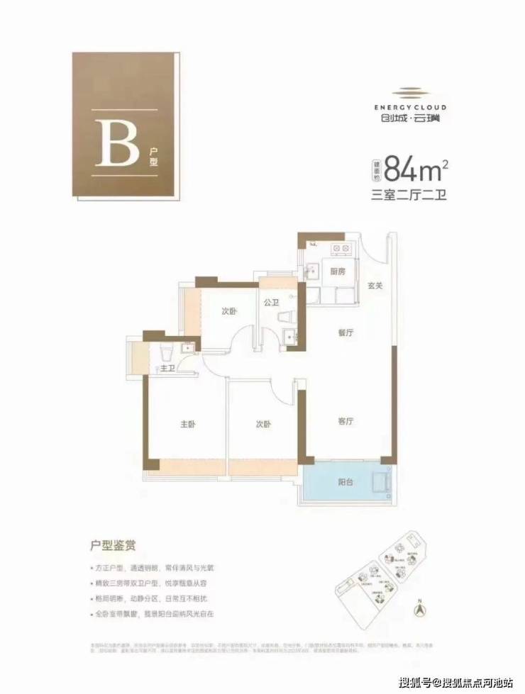 84㎡的3房2厅2卫,设计的竖厅格局,有西南向,西北向,东南朝向。