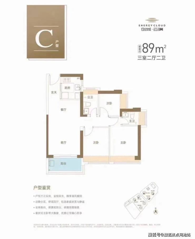 89㎡的3房2厅2卫,设计的经典竖厅格局,有南向,东南朝向。