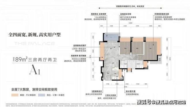 亮点1:客厅270度采光设计,客厅更是采用了当下最流行的设计风格「无主厅化」,而且客厅的凸窗进深达到了80CM。