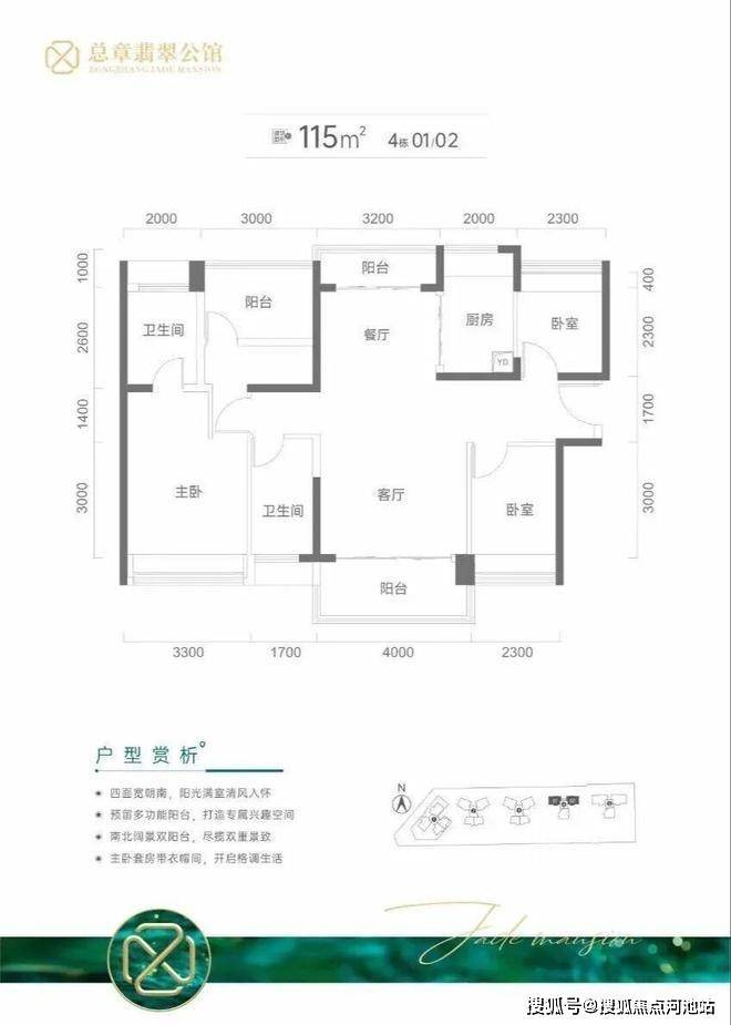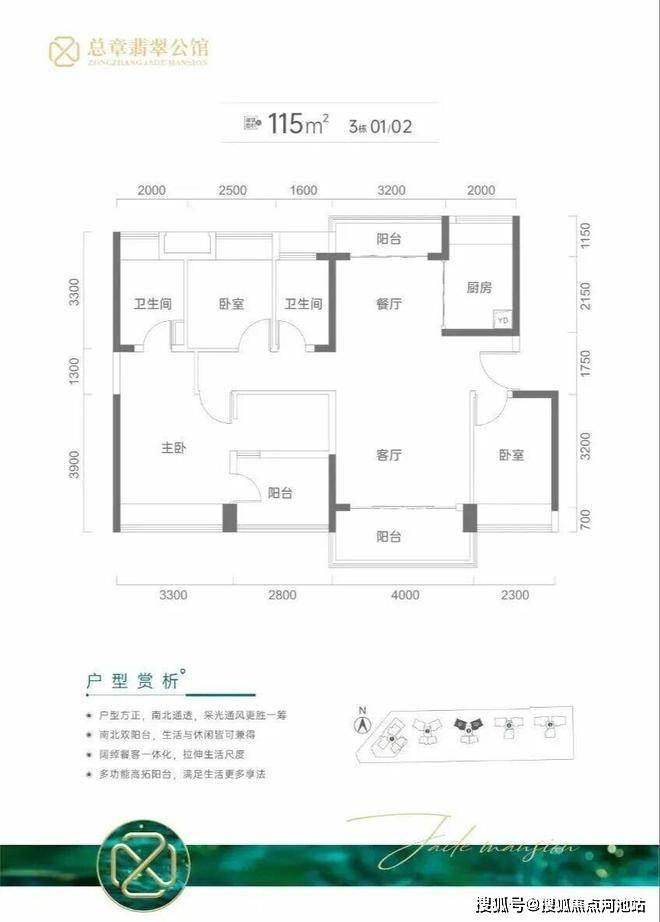 建面115㎡:4房2卫,这种户型有3种朝向,3栋01户型西南/东北通透主阳台朝西南,3栋02户型东南/西北通透主阳台朝东南,4栋01/02户型南/北通透户型阳台朝南;