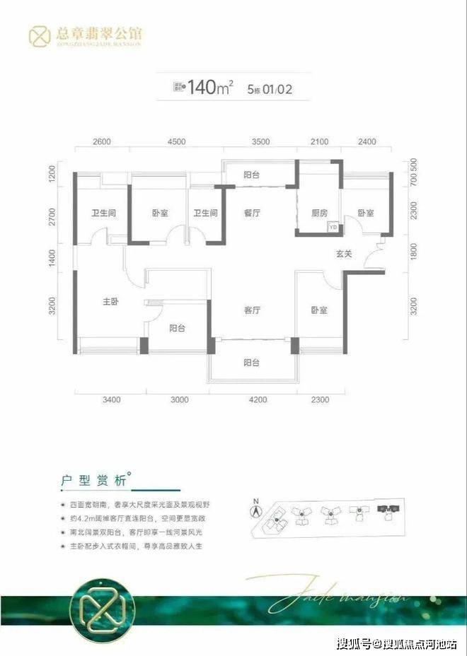 140㎡4+1房二卫:该户型是「总章翡翠公馆」的最大面积户型,实际上可以做到五房二卫。南山区很少有140㎡面积段做得出五房双阳台的设计,实际使用率也接近80%,南/北通透的户型非常舒服。
