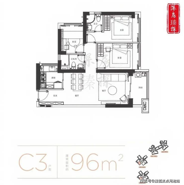 96㎡的3房2厅2卫,折后总价450万起,单价4.68万/㎡起。