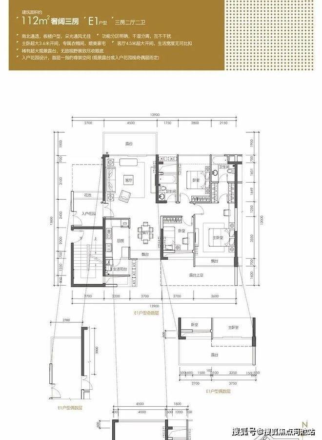 112㎡的3房2厅2卫,设计的是竖厅南北通透格局,客厅4.5米超大开间,主卧3.6米开间,带大入户花园,L型厨房。