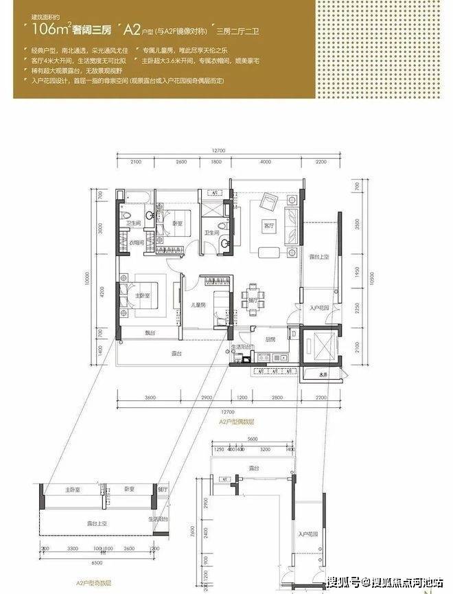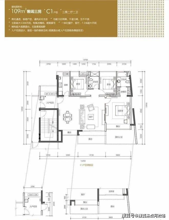 109㎡的3房2厅2卫,设计的是横厅南北通透格局,一体化餐客厅,7.2米超大开间,带大入户花园,主卧3.8米开间,L型厨房。