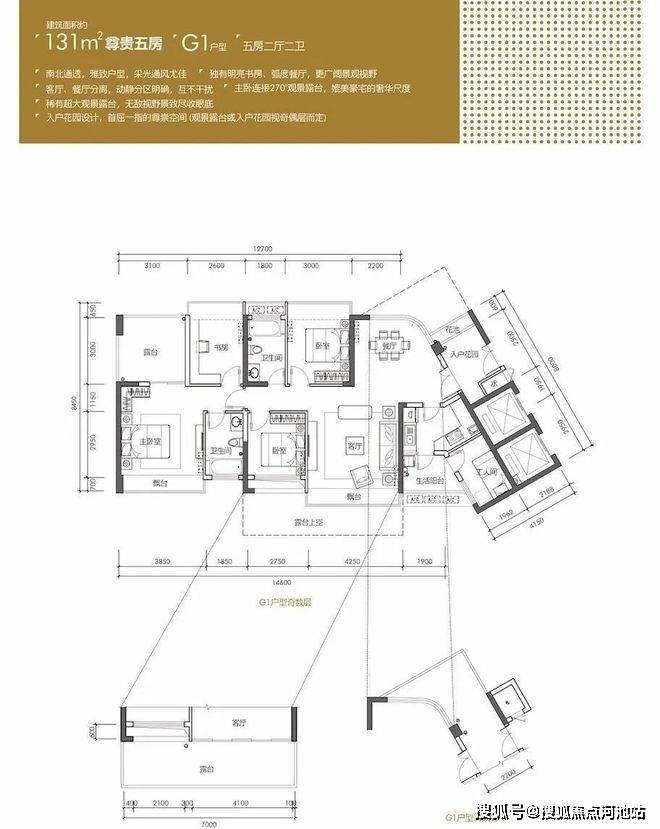 131㎡的5房2厅2卫,设计的是竖厅南北通透格局,客厅4.25米开间,客餐厅分离设计,主卧连接270°观景露台,带大入户花园设计,还有观景露台。
