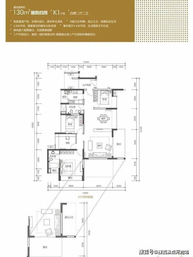 130㎡的4房2厅2卫,设计的是横厅通透格局,客厅4.6米开间,带大入户花园,主卧3.8米开间,东南向设计。