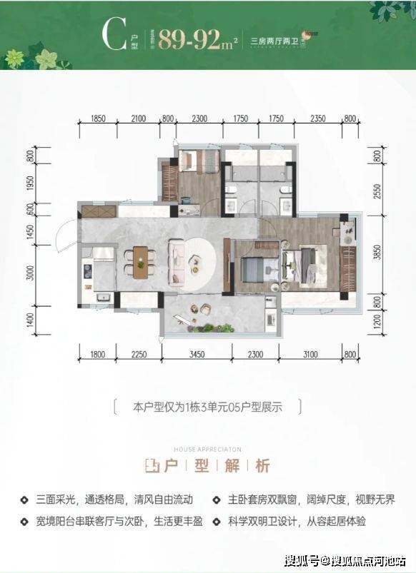 92㎡三房二卫(横厅):440-493万 ,拓展后实际使用率约102%-105%;