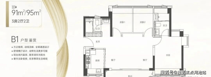 91-95㎡3房2卫:采用横厅布局,客厅与餐厅一体化,开间5.3m,形成开阔的公共空间。主卧为套房设计,带独立卫生间和衣帽间,次卧尺寸适中,能满足家庭成员居住需求。厨房为U型设计,操作动线合理,部分户型预留冰箱位。主卧13㎡-15㎡,次卧8㎡-10㎡,得房率84%
