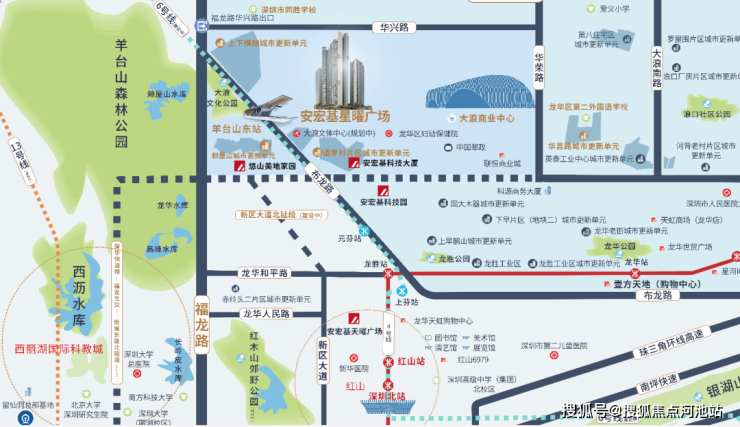 安宏基星曜广场项目位于深圳市龙华区中核,西望羊台山,毗邻地铁6号线,三站可达中心区,具有得天独厚的交通优势。星曜广场为建面约17万方标杆综合体,集萃写字楼、商业、住宅、产业园于一体。