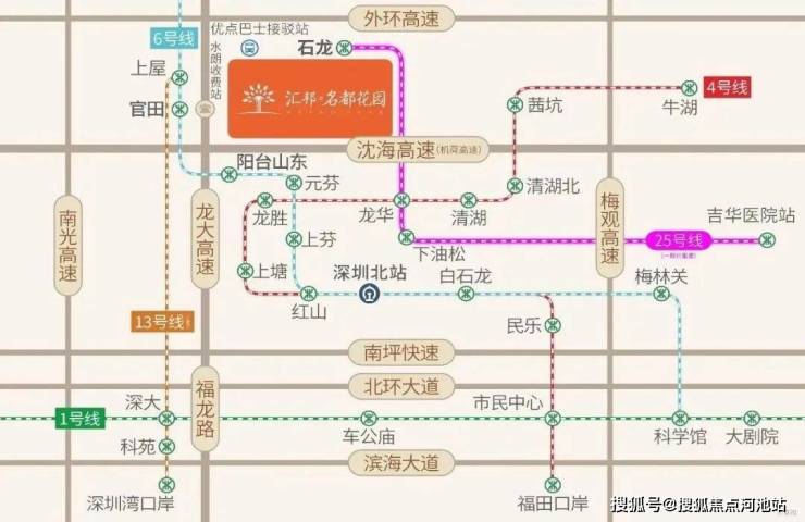 项目位于龙大高速水朗出口旁,邻近地铁6号线(已开通)、13号线(在建)及地铁25号线(已开工在建)。畅享龙大、南光、广深、沈海(机荷)四大高速路网,社区接驳优点巴士,6条短线直达6大地铁站(阳台山东、龙胜、元芬地铁接驳已开通)、3条快线直达车公庙(已开通)/科技园(已开通)/大剧院等中心区。