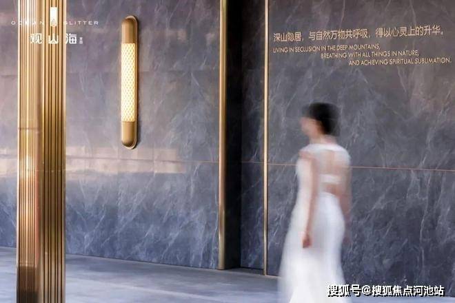 入口大景墙全部采用温德姆灰石材,搭配普拉达绿大理石,还有用金属壁灯和金丝网垂缦装点的通道,是独属于观山海家园业主的尊贵归家礼序。