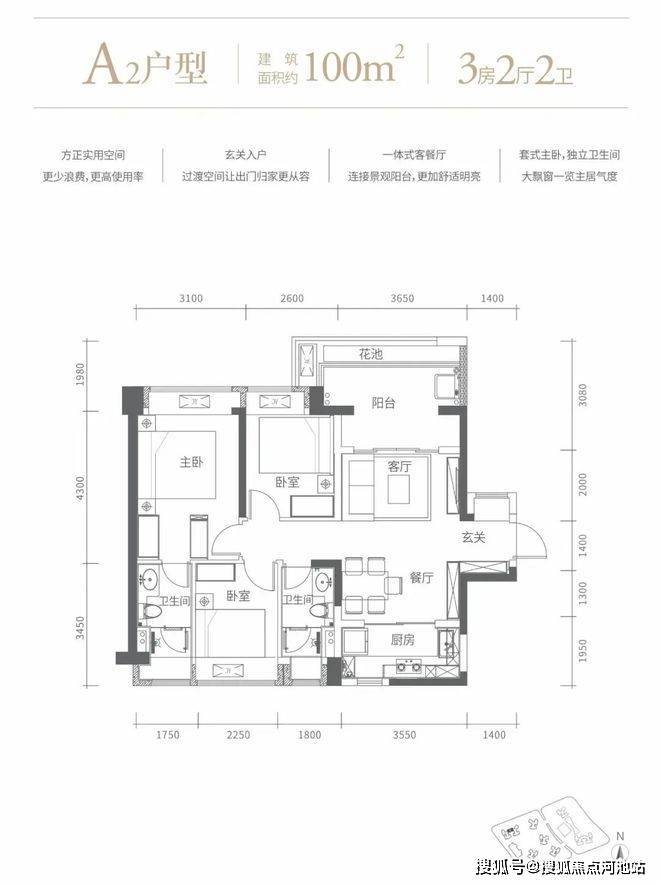 100㎡的3房2厅2卫,A2户型,设计的是竖厅格局,客厅3.65米开间,进门玄关,LDKB一体化设计,动静分区,3个卧室分别做到了主卧15.19㎡/次卧8.32㎡/次卧7.76㎡(包含墙体飘窗),L型厨房,卫生间干湿分离,得房率72.63%(不含赠送),阳台主朝东北向。