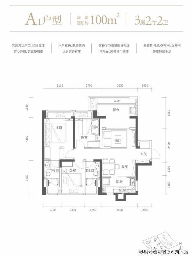 100㎡的3房2厅2卫,A1户型,设计的是竖厅格局,客厅3.55米开间,进门玄关,LDKB一体化设计,动静分区,3个卧室分别做到了主卧15.19㎡/次卧8.64㎡/次卧7.93㎡(包含墙体飘窗),L型厨房,卫生间干湿分离,得房率72.63%(不含赠送),阳台主朝西北向。