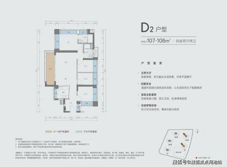 在四房二卫户型中,D1和D2的整体设计相似,都采用横厅户型,唯一的区别在于阳台的设计。