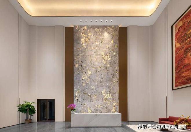 从社区主入口的酒店式归家大堂开始,体验便不同凡响。意大利宝格丽奢石接待台、巴西潘多拉透光奢石背景墙、约9米挑高的弧顶艺术涂料天花板与牡丹油画挂画,共同营造出入户的尊崇仪式感。两侧对植的约20年树龄造型冬青,以盎然生机寓意“基业长青”,仪式感与归属感自此油然而生。