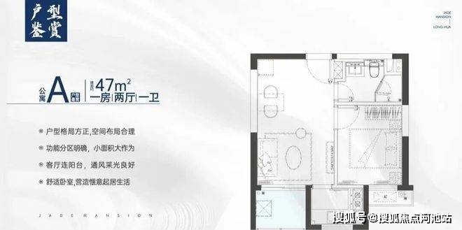 约47㎡ 做到一房两厅一卫功能布局,独立明厨和干湿分离卫浴,客厅开间约3.5米,厅出阳台。