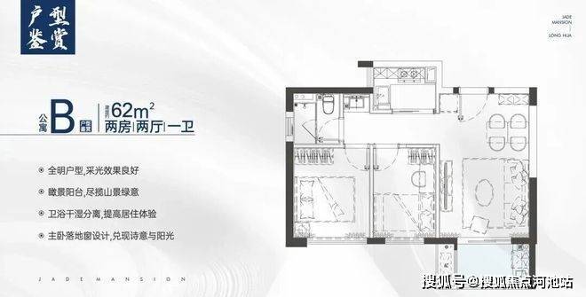 约62㎡ 实现两房两厅一卫功能配置,独立明厨和三分离明亮卫浴,主卧可放置2米双人床,厅出阳台。