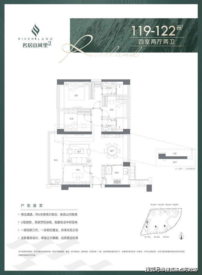 119-122㎡的4房2厅2卫,设计的是竖厅南北通透格局,客厅3.8米开间,四开间朝南,全屋飘窗,U型厨房,得房率:74.83%(不含赠送),阳台1.5米进深,6米长超大阳台,主朝西南向。