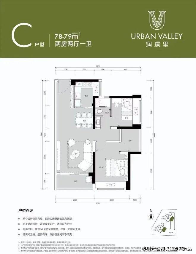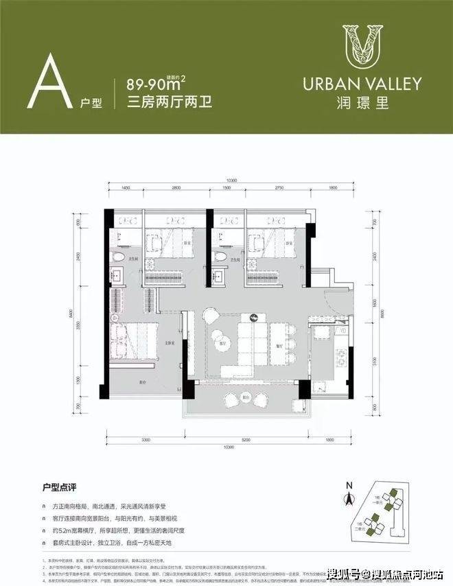 设计的是竖厅格局,LDKB客厅一体化设计,客厅3.5米开间,3个卧室分别做到了3.2米/2.8米/2.3米的宽度,U型厨房,卫生间三段式分离,阳台都是东南朝向。