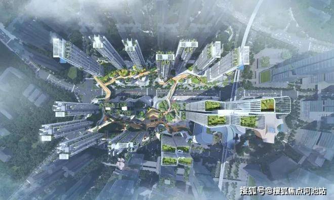 北区做的是空中花园,1楼地面规划有公交首末站,公共充电站,二楼空中花园规划有地铁主题儿童乐园,会客厅;南区规划了1栋总高239米,1栋总高250米的写字楼超塔,还有2栋人才房,总高625套。