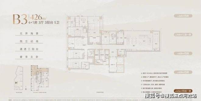 • 适配人群:预算6000-7000万,注重空间实用性的高端家庭2. 427㎡4+1房五卫+家庭厅(B3户型)