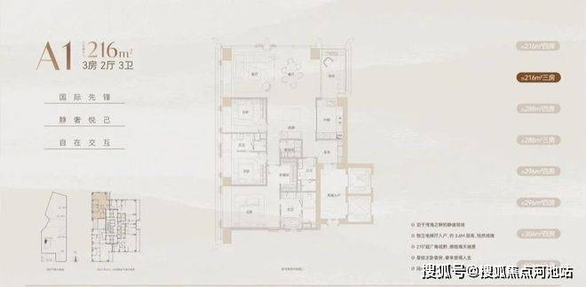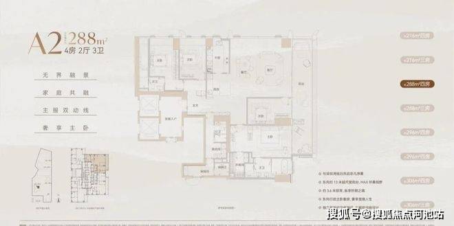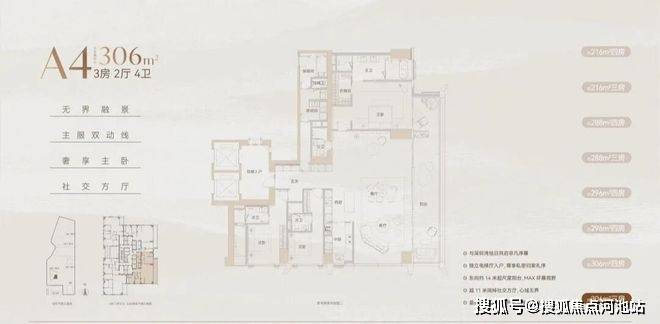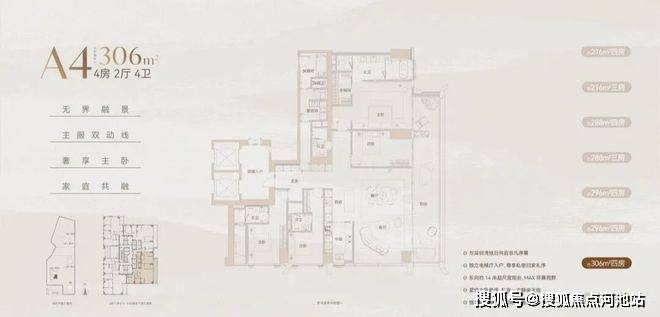• 适配人群:多孩家庭、三代同堂,对南向朝向和功能性有刚性需求4. 306㎡四房四卫+保姆套间(A4户型)