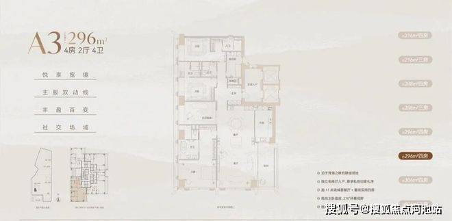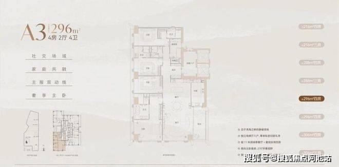 • 选房建议:优先考虑三房布局,动区尺度感远超四房,适合注重景观与居住舒适度的家庭3. 296㎡四房四卫+保姆套间(A3户型)