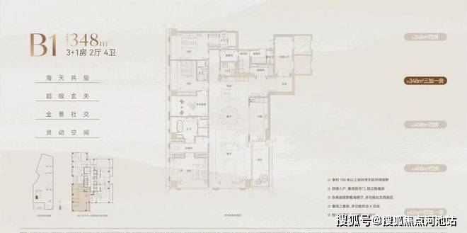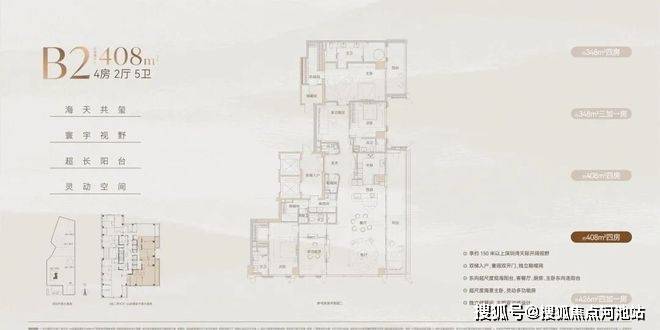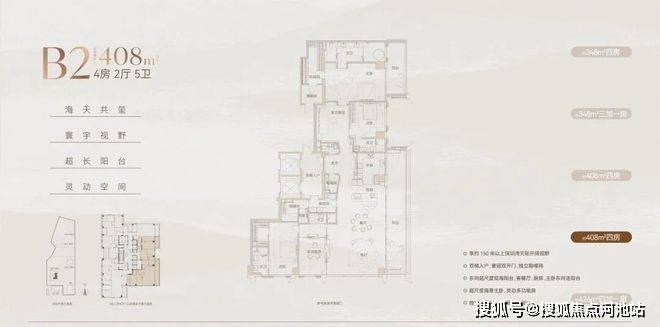 • 适配人群:预算7000-8000万,追求空间尺度与装修质感的终改家庭3. 408㎡4+1房五卫+家庭厅(B2户型)