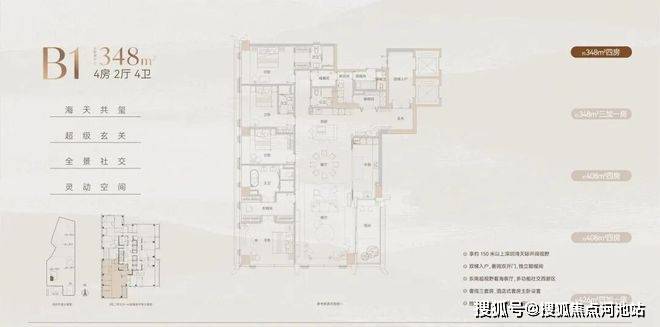 • 适配人群:预算4900万+,追求景观、采光与功能性全能的品质改善家庭(二)T3高区(6300万-1.027亿):顶豪终改,天际视野1. 349㎡四房四卫+保姆套间(B1户型)