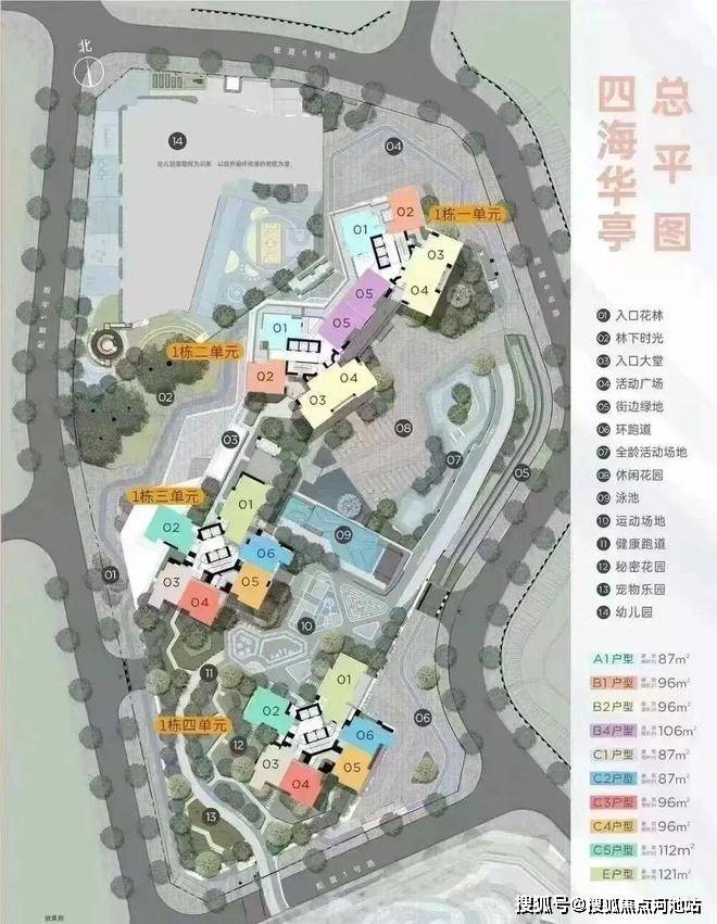 四海华亭,占地面积约1.7万㎡,建筑面积约16.4万㎡,容积率6.81,绿化率30.59%,共4栋51-52层高住宅,由1栋1-4单元组成,其中1栋1.2单元是3梯5户设计,1栋3.4单元是4梯6户设计,可售商品房有1044套,车位数1249个。
